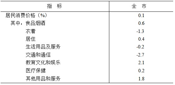 全年居民消費(fèi)價(jià)格比上年上漲0.1%。分類別看,食品煙酒、居住、教育文化和娛樂、醫(yī)療保健、其他用品和服務(wù)等價(jià)格分別上漲0.6%、0.4%、2.1%、0.2%、1.8%;衣著、生活用品及服務(wù)、交通和通信等價(jià)格分別下降 1.3%、0.2%、2.7%。