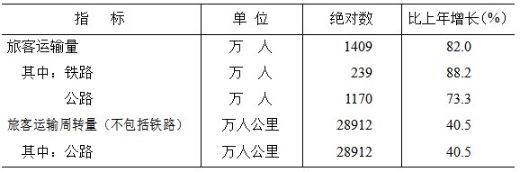 全年旅客運(yùn)輸量1409萬人,比上年增長(zhǎng)82%;貨物運(yùn)輸量21468萬噸,增長(zhǎng)15.5%。旅客運(yùn)輸周轉(zhuǎn)量(不包括鐵路)28912萬人公里,增長(zhǎng)40.5%;貨物運(yùn)輸周轉(zhuǎn)量(不包括鐵路)7034730萬噸公里,增長(zhǎng)9%。港口貨物吞吐量14347.2萬噸,增長(zhǎng)9.8%,其中外貿(mào)貨物吞吐量17.2萬噸,下降19.2%。港口集裝箱吞吐量19199標(biāo)準(zhǔn)箱(TEU),增長(zhǎng)54.6%。