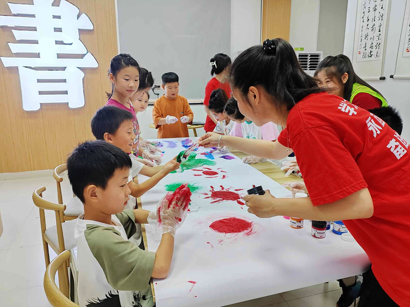 為豐富社區(qū)青少年的暑假生活,貴池區(qū)清溪街道翠屏苑社區(qū)新時(shí)代文明實(shí)踐站聯(lián)合池州學(xué)院開(kāi)展為期兩周的暑期課堂志愿服務(wù)活動(dòng)。期間,大學(xué)生志愿者除了輔導(dǎo)孩子們寫(xiě)作業(yè),還開(kāi)設(shè)了繪畫(huà)、圍棋、科普等特色課程。圖為7月20日,志愿者在教孩子涂鴉繪畫(huà)。