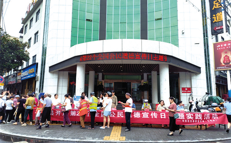 9月20日,縣委宣傳部(文明辦)聯(lián)合多家單位開展第22個(gè)“全國公民道德宣傳日”主題實(shí)踐活動(dòng)?;顒?dòng)現(xiàn)場,工作人員通過發(fā)放宣傳資料等形式,向過往市民普及公民道德規(guī)范、文明交通禮儀等知識(shí),并從“什么是公民道德宣傳日、設(shè)立公民道德宣傳日的目的、公民基本道德規(guī)范的內(nèi)容”等方面進(jìn)行宣傳解讀。圖為志愿者在發(fā)放各類宣傳資料。通訊員 許淑玲 攝