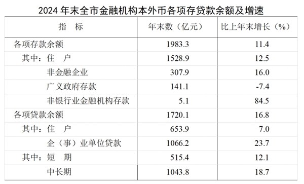 年末金融機(jī)構(gòu)本外幣各項(xiàng)存款余額1983.3億元,比上年末增長11.4%,比年初增加203.1億元。其中,住戶存款余額1528.9億元,增長12.5%;非金融企業(yè)存款余額307.9億元,增長16%。金融機(jī)構(gòu)本外幣各項(xiàng)貸款余額1720.1億元,增長16.8%,比年初增加246.8億元。其中,短期貸款余額515.4億元,增長12.1%;中長期貸款余額1043.8億元,增長18.7%。