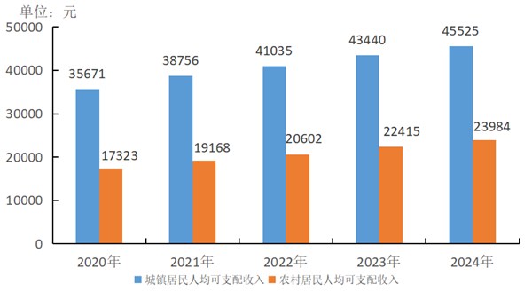 2020—2024年全市城、鄉(xiāng)居民人均可支配收入