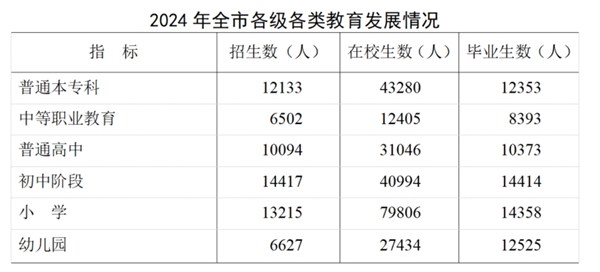 年末全市共有普通高等教育學(xué)校3所,普通本??圃谛W(xué)生43280人,成人在校學(xué)生7641人。中等職業(yè)教育學(xué)校5所,在校學(xué)生12405人。普通中學(xué)90所,在校學(xué)生72040人。其中,高中在校學(xué)生31046人,高中階段毛入學(xué)率98.9%;初中在校學(xué)生40994人,初中學(xué)齡人口毛入學(xué)率103.2%。小學(xué)138所,在校學(xué)生79806人,小學(xué)毛入學(xué)率102.3%。