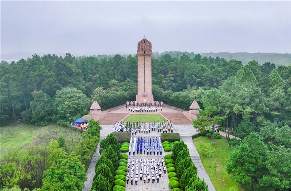 池州烈士陵園內(nèi),秋雨中的蒼松翠柏掩映著革命烈士紀念塔巍然聳立、靜穆莊嚴。參加儀式的各界代表懷著無比崇敬的心情,面向紀念碑整齊列隊。上午8時30分,敬獻花籃儀式正式開始,禮兵整齊隊伍走向紀念塔。18名身姿挺拔的禮兵,踏著整齊劃一的步伐,堅定地走向烈士陵園紀念塔,在那里莊重地佇立。隨著《中華人民共和國國歌》的雄壯旋律響起,全場人員齊聲高唱。唱畢,大家紛紛脫帽,肅立默哀,向英勇犧牲的烈士們致以最深的敬意。