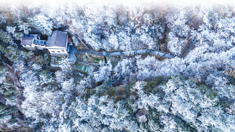 受寒潮影響,11月17日夜間,九華山風(fēng)景區(qū)迎來(lái)今冬首場(chǎng)降雪。一夜之間,原本五彩斑斕的山林銀裝素裹,宛如仙境,吸引不少游客次日登山,欣賞這如畫(huà)般的琉璃世界。