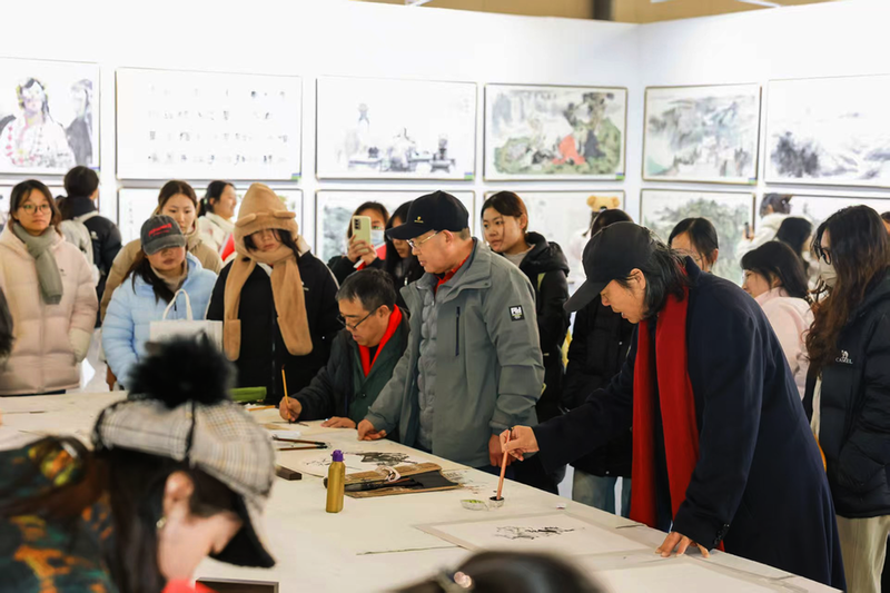 書畫展為期一周,共展出來自全國25個省市自治區(qū)的186位書畫名家的精品力作。現(xiàn)場還舉行了《“兼濟(jì)天下·口子窖杯”中國水墨名家書畫展作品集》與《杏花村書畫院館藏書畫精品臺歷》首發(fā)式,多維度呈現(xiàn)水墨藝術(shù)魅力。圖為書畫名家在書畫展現(xiàn)場作畫。