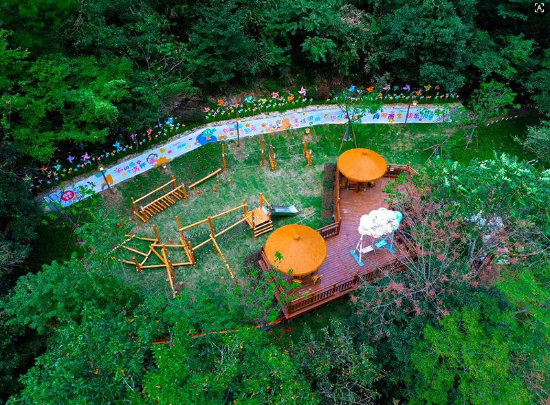 谷中并非只有石與水,更有古木與苔痕交織的幽微生機(jī)。自“孔雀瀑”上行,步道轉(zhuǎn)入名為“綠野仙蹤”的原始林帶。濃蔭蔽日,古木參天,樹齡480年的紫薇與680年的甜櫧交織成穹蓋,枝椏間垂下細(xì)長松蘿,風(fēng)過時微微搖曳。林間鋪設(shè)木質(zhì)平臺與樹屋,孩童的笑聲與鳥鳴相和,為清冷的初冬添了幾分暖意。更妙的是林中“尋羽門”—— 一座由七彩鵝卵石壘成的拱門,門后小徑通向幽深洞穴,傳說拾得洞中白羽者可獲“仙緣”。我卻在石徑旁停?。阂恢昀蠘涓祻氖p間蜿蜒而出,緊緊“抱”住堅硬巖體,仿佛誓與石頭共存亡。它把根須扎進(jìn)最貧瘠的縫隙,把軀干伸向最稀薄的光線,年復(fù)一年,把傷痕長成姿態(tài)。這樣的生命,與谷中石頭互為映照—— 一個柔韌,一個堅剛;一個向下生長,一個向上屹立。人與自然在此達(dá)成默契,彼此守望,彼此成全。