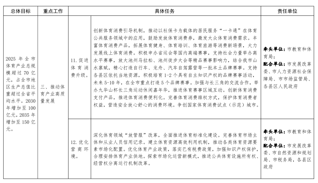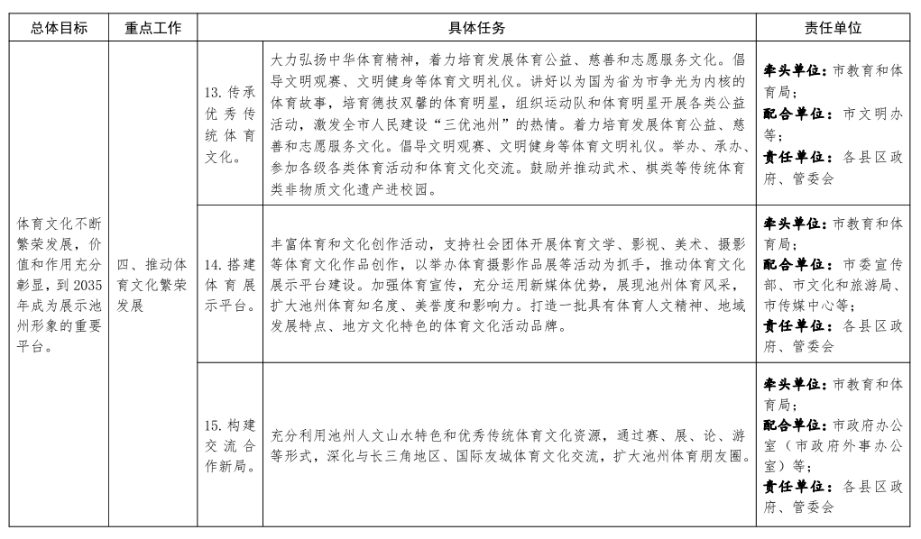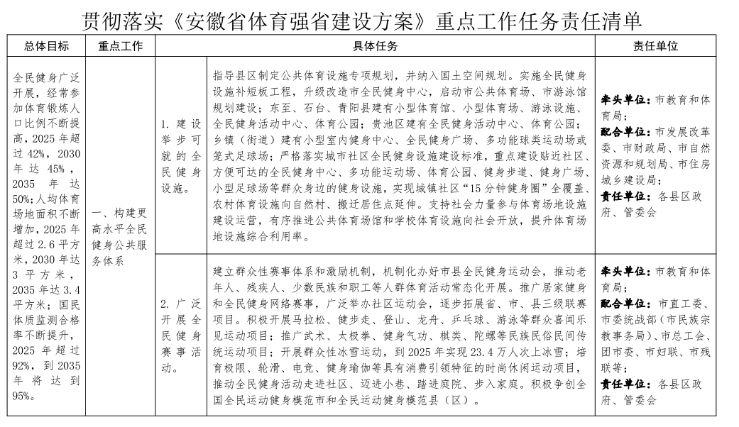 | 標(biāo)題: | 池州市人民政府辦公室關(guān)于印發(fā)貫徹落實(shí)安徽省體育強(qiáng)省建設(shè)方案重點(diǎn)工作任務(wù)責(zé)任清單的通知 | 文號(hào): | 池政辦秘〔2021〕110號(hào) |