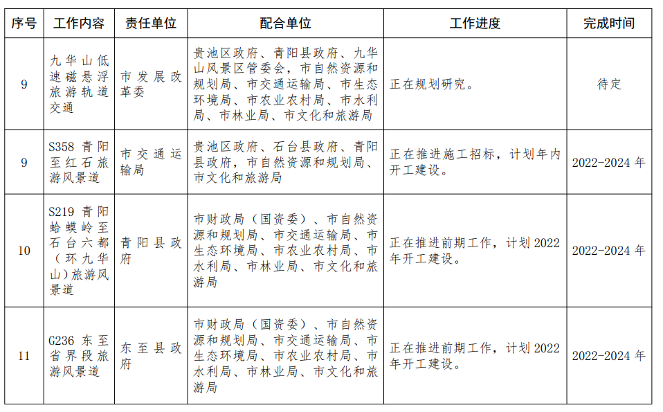 2.完善區(qū)域“慢游”交通基礎(chǔ)網(wǎng)絡(luò)。建設(shè)集“吃住行游購娛”于一體的“慢游”交通網(wǎng)絡(luò)。圍繞“以九華山為龍頭、多板塊協(xié)同”旅游格局,加快推進S358青陽至紅石、S219青陽蛤蟆嶺至石臺六都(環(huán)九華山)、G236東至省界段和G530石臺至查橋(石臺段)等旅游風(fēng)景道建設(shè),打造具有皖南文化特色的生態(tài)旅游目的地?!藏?zé)任單位:各縣區(qū)政府,九華山風(fēng)景區(qū)、開發(fā)區(qū)管委會,市發(fā)展改革委、市財政局(國資委)、市自然資源和規(guī)劃局、市生態(tài)環(huán)境局、市交通運輸局、市農(nóng)業(yè)農(nóng)村局、市水利局、市林業(yè)局、市文化和旅游局按職責(zé)分工負(fù)責(zé)〕